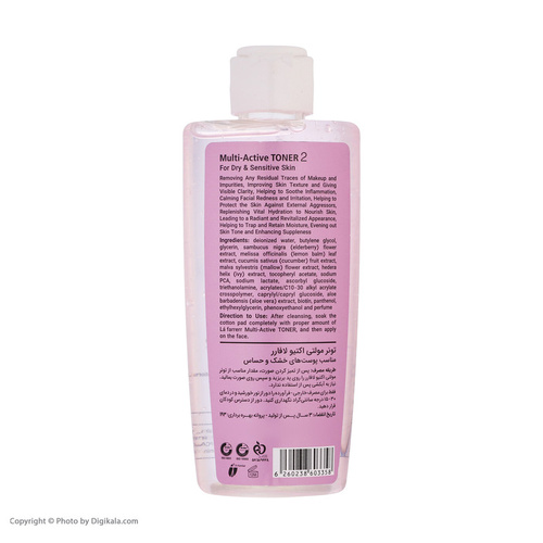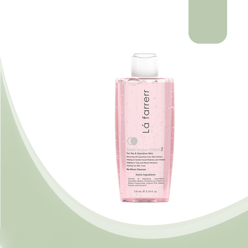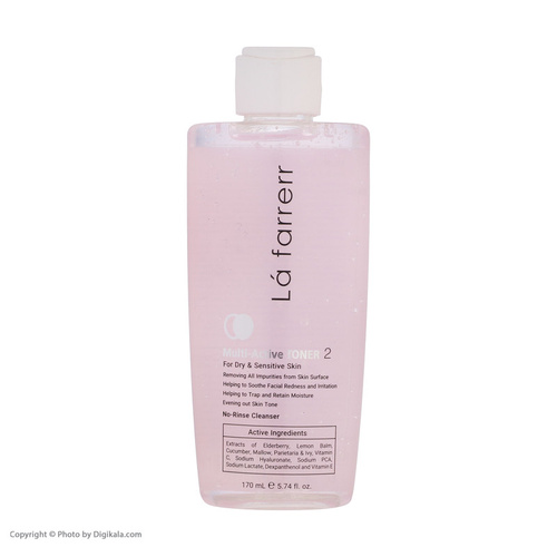 تونر مولتی اکتیو لافارر مخصوص پوستهای خشک و حساس حاوی عصاره پیچک، عصاره خیار، عصاره ملیسا، عصاره پاریتاریا، عصاره اِلدربری، عصاره پنیرک، سدیم لاکتات، Na-PCA، سدیم هیالورونات و ویتامین ای و سی است که علاوه بر کاهش التهابات و حساسیتهای پوستی سبب رطوبترسانی، کاهش سایز منافذ باز و پاکسازی آن میگردد.